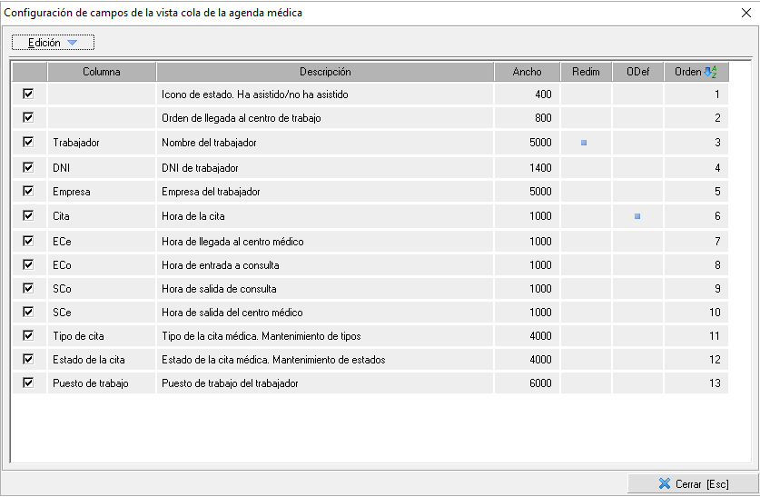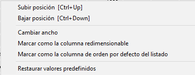 Además, con el botón derecho del ratón teniendo alguna de las columnas seleccionada nos permite marcar dicha columna para que nuestras vistas se ordenen por defecto desde esa columna seleccionando " Marcar la columna de orden por defecto del listado". Si seleccionamos la opción superior "Marcar como la columna redimensionable" nos permitirá modificar el ancho de dicha columna una vez salgamos de esta pantalla.