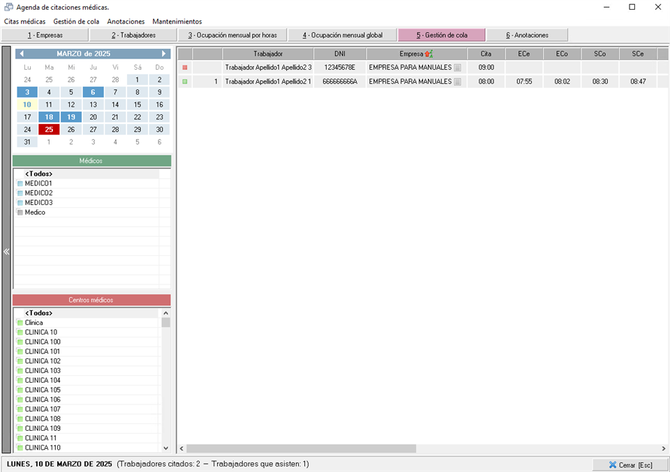 Una vez habilitado la vista mencionada y situados en un día con citas médicas, veremos el listado de trabajadores que están citados para pasar reconocimiento (imagen anterior). El orden de la cola se actualizará automáticamente al editar a estos trabajadores o al asignarles 'entrada al centro' de reconocimientos.