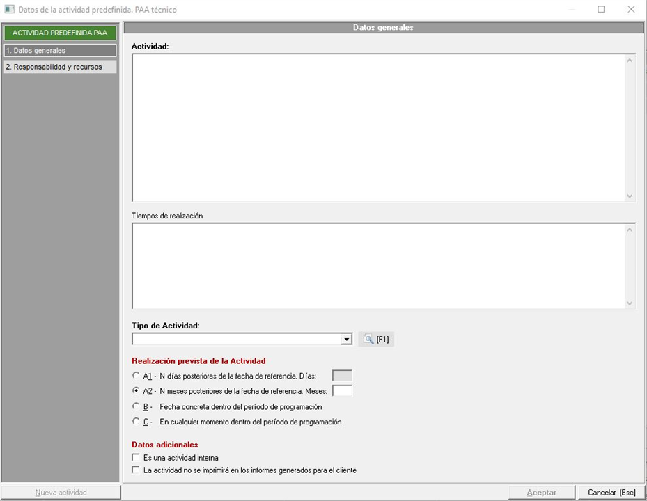 Dentro de la primera pestaña de Datos generales encontrarán un primer campo donde deben establecer la propia Actividad predefinida, seguida de un segundo campo para establecer una descripción a los tiempos de realización, dicho campo cambiara de posición al insertar la actividad en un PAA situándose debajo de la descripción de la actividad. Seguidamente establecerán, como campo de cumplimentación obligatorio, el Tipo de actividad, proveniente de un mantenimiento donde pueden crear y editar elementos.