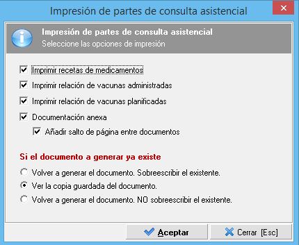 Es la primera opción que nos aparece en el desplegable y con ella generaremos el parte de la consulta médica o de enfermería de todos los que tengamos seleccionados. Una vez ejecutada nos mostrará un pequeño esquema de impresión similar al siguiente: