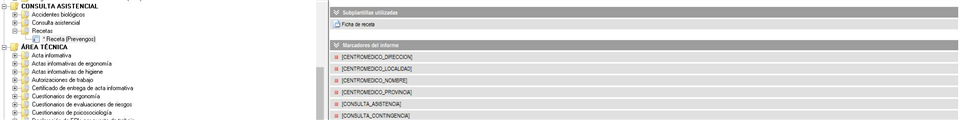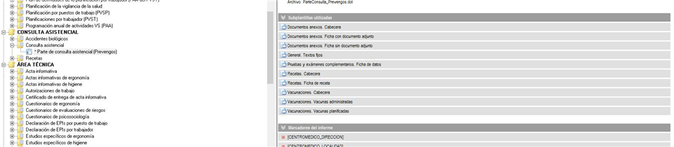Para generar este documento, Prevengos usa una plantilla que podemos encontrar en el mantenimiento de plantillas. Dentro de esta plantilla podemos encontrar subplantillas para la impresión de documentos anexos, pruebas, recetas y vacunaciones, tal y como vemos en la siguiente imagen: