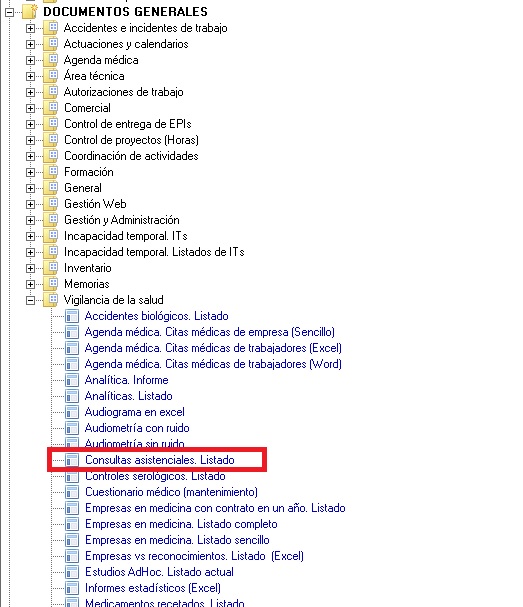 Con esta opción Prevengos genera un documentos de Word con el listado de las consultas tanto médicas como de enfermería que tengamos en pantalla. Esta cantidad de consultas puede ser resultante de una búsqueda que se puede realizar desde el desplegable "Vista"