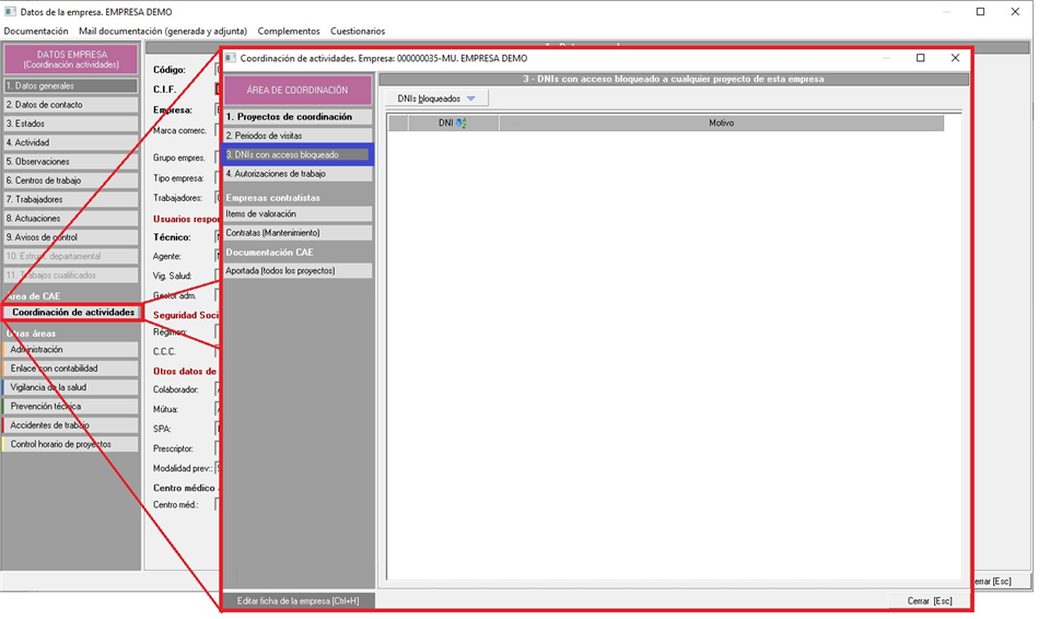 Prevengos dispone de una utilidad, a nivel de empresa, para bloquear el intento de acceso de un trabajador a los centros o proyectos de la empresa correspondiente, mediante el bloqueo del DNI de dicho trabajador. Esta configuración se realiza desde la ficha de la empresa, en el apartado de Coordinación de Actividades, tal como podemos ver en la siguiente imagen:
