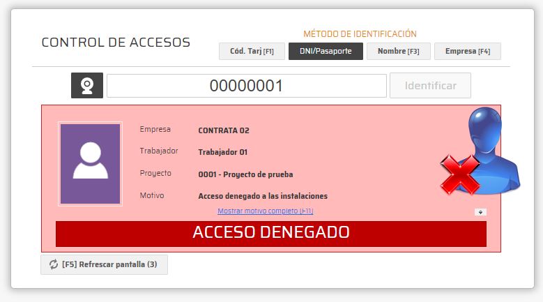 Tal y como podemos apreciar, nos informa de la empresa en la que nos encontramos y, por ello, en la que se aplicará esta restricción. Seguidamente indicaremos el DNI del trabajador y el motivo del bloqueo. Cuando este trabajador intente pasar por el control de accesos y tecleen su DNI, no se le permitirá la entrada al centro y el usuario del control de accesos podrá ver los motivos por los que está bloqueado dicho acceso, tal y como se muestra en la siguiente captura: