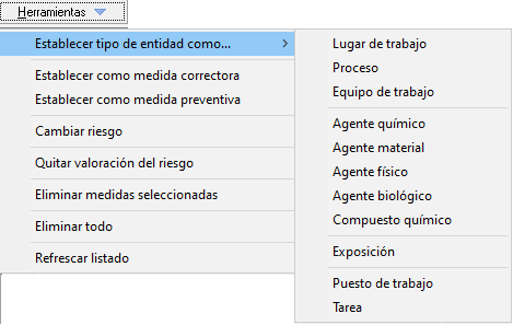 Como podrá observar, dispone de información en pantalla acerca de la entidad que se ha procesado. El tipo de entidad, se refiere al elemento evaluable en cuestión, por lo que podrá comprobar si su nombre coincide con su tipo. Por ejemplo, podrá comprobar si "Adjunto/a" corresponde a un "Puesto de trabajo". También podrá encontrar información sobre si es una medida preventiva o correctora, el riesgo en cuestión que se ha identificado, etc. Estos datos se podrán modificar mediante el desplegable "Herramientas".