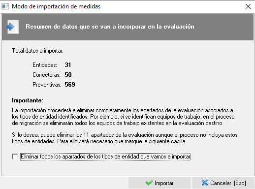 Independientemente de si decide eliminar todos los tipos de entidad o no, tenga en cuenta que siempre se eliminará la información actual de la entidad que se importará en la Evaluación de Seguridad existente antes de cargar el archivo. Es decir, si importa un excel con Puestos de trabajo (entidad) se eliminarán todos los Puestos que contenga la Evaluación antes de la importación.