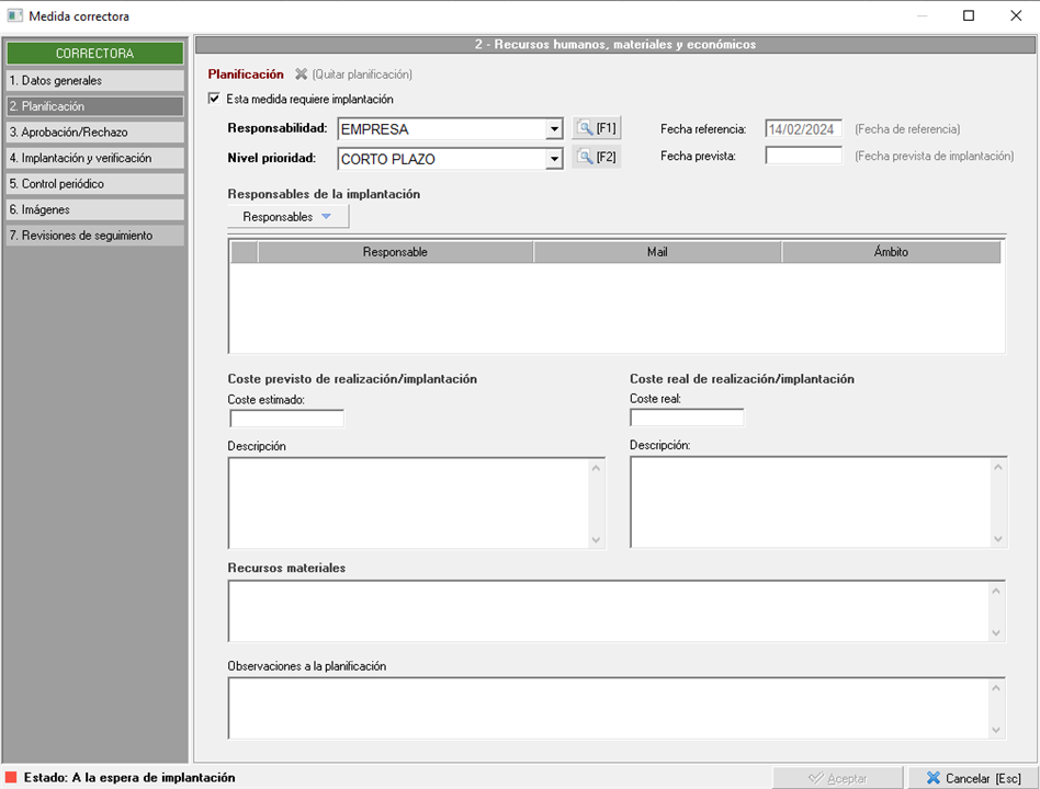 "Fecha inicio", "Fecha fin", "Periodicidad", "Fecha realización", "Fecha próximo control", "Responsable implantación", "Responsable seguim./Cont.", "Estado".