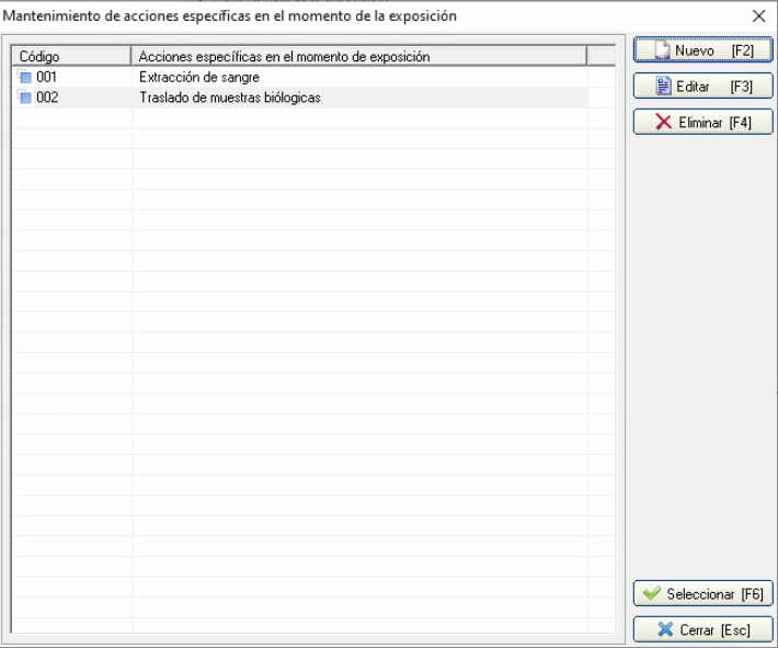 Este es un mantenimiento sencillo, donde debe registrar las acciones específicas en el momento de la exposición. Este mantenimiento se utiliza en la ficha de un accidente biólogico en la pestaña 'Exposición I' para indicar la actividad específica que estaba realizando el trabajador en el momento del accidente.