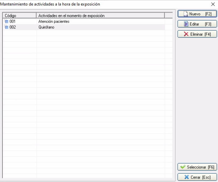 Este es un mantenimiento muy similar al anterior, donde debe registrar las actividades genéricas en el momento de la exposición. Este mantenimiento se utiliza en la ficha de un accidente biólogico en la pestaña 'Exposición I' para indicar la actividad que estaba realizando el trabajador en el momento del accidente.