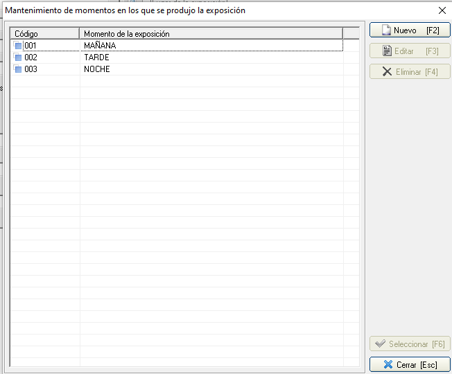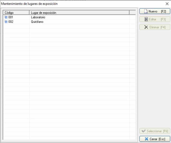 Este mantenimiento también es muy similar al anterior, donde debe registrar los lugares donde se puede tener exposición a algún agente biológico. Este mantenimiento se utiliza en la ficha de un accidente biólogico en la pestaña 'Exposición I' para indicar el lugar donde ha estado expuesto el trabajador.