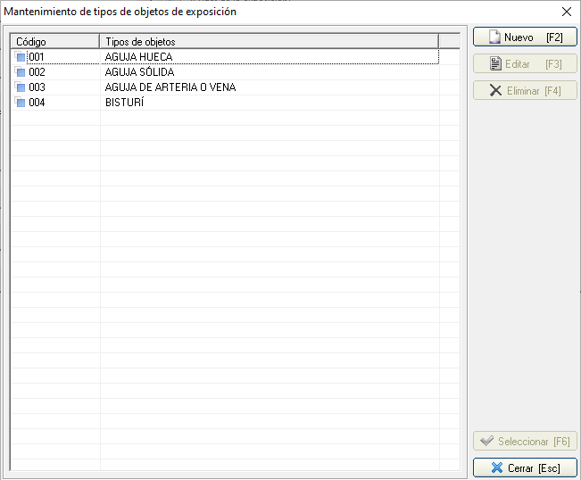 Como el resto de mantenimientos de este manual, debe registrar los objetos con los que se puede producir la exposición. Este mantenimiento se utiliza en la ficha de un accidente biólogico en la pestaña 'Exposición I' para indicar con que tipo de objeto se ha producido la exposición.