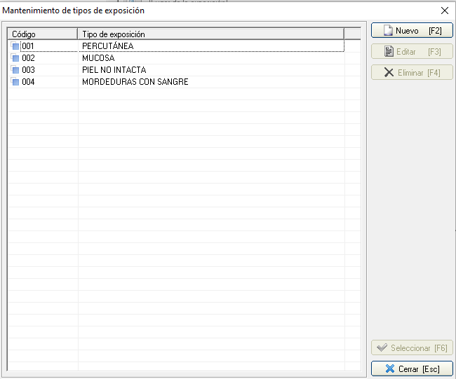 En este mantenimiento debe registrar los diferentes tipos de exposición posibles. Este mantenimiento es importante, ya que al registrar un accidente biológico, este es un campo obligatorio, situado en la pestaña 'Exposición I'.