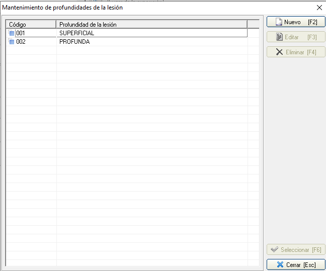 En este mantenimiento se registra la profundidad que puede tener la lesión. Este mantenimiento se utiliza en la ficha de un accidente biólogico en la pestaña 'Exposición I' para indicar si la profundidad de la lesión que ha sufrido el trabajador.