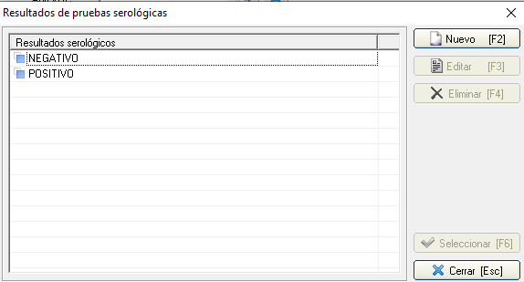 En este mantenimiento se registran los posibles resultados serológicos. Este mantenimiento se utiliza en la ficha del accidente biológico, para indicar los resultados de todas las pruebas serológicas en la pestaña 'Serología de la fuente', como por ejemplo para indicar si los valores de la serología del virus de la hepatitis B.