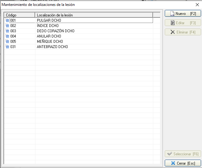 En este mantenimiento debe crear todos las localizaciones del cuerpo donde se puede producir la lesión. Este mantenimiento se utiliza en la ficha de un accidente biólogico en la pestaña 'Exposición II' para indicar que parte del cuerpo del trabajador ha sido lesionada.