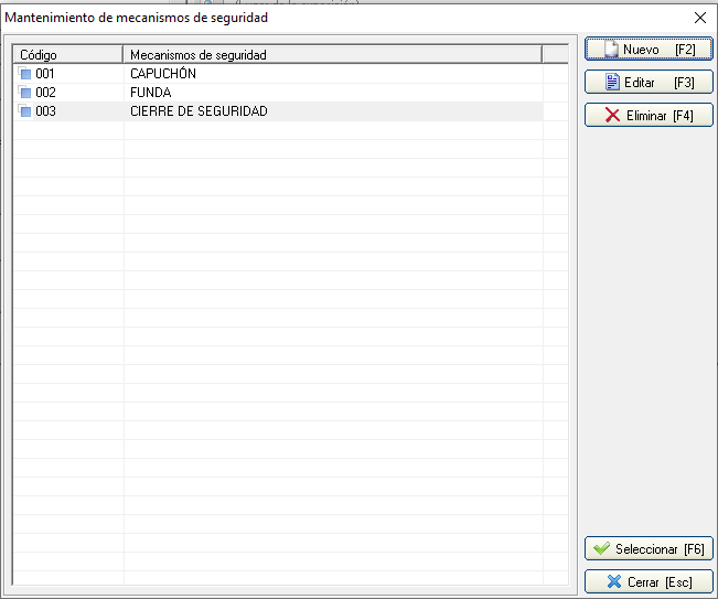 En este mantenimiento se registra los mecanismos de seguridad que pueden tener los objetos causantes de lesión. Este mantenimiento se utiliza en la ficha de un accidente biólogico en la pestaña 'Exposición I' en el campo seguridad.