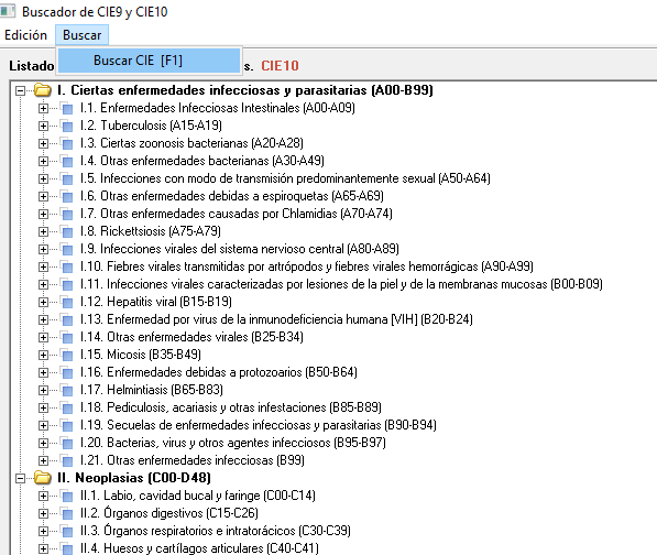 En la parte superior dispone también de un menú de búsqueda 'Buscar' donde podrá identificar las enfermedades por código o por descripción y pinchando en el botón 'Buscar ahora (F1) ':