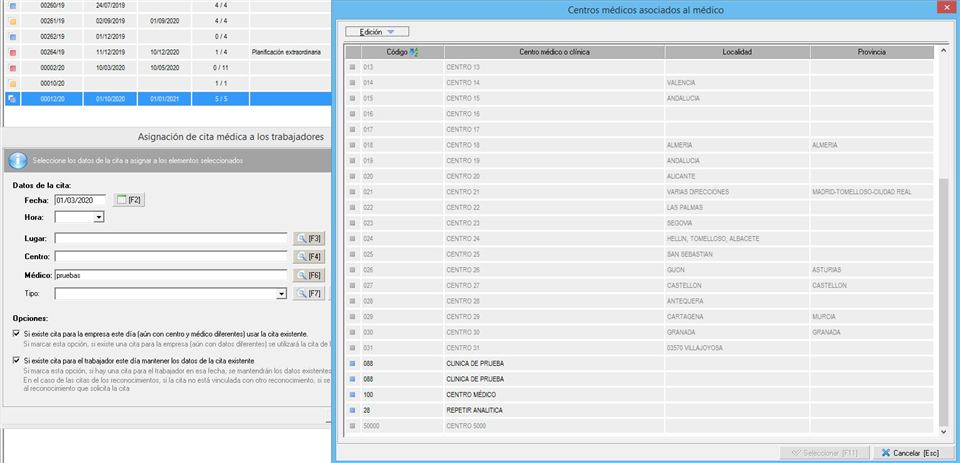 En esta pantalla es donde se van a aplicar esas relaciones que mencionamos en el punto anterior. Si al dar la cita primero seleccionamos un médico, en el siguiente paso cuando abramos el listado de centros médicos, Prevengos nos pondrá en gris aquellos que no están asociados al médico seleccionado, pese a que nos permita seleccionar cualquiera. Igual pasa a la inversa, si seleccionamos un centro médico, Prevengos nos pone en gris aquellos médicos que no están asociados al centro seleccionado.