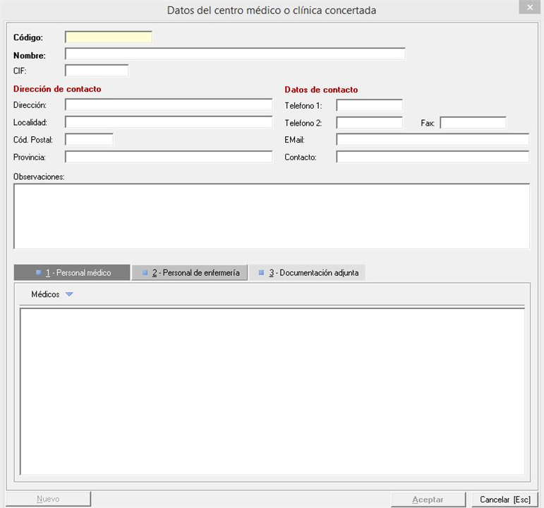 En Prevengos disponemos de un mantenimiento general para albergar toda la información relacionada con los datos de los centros médicos y/o clínicas concertadas que se van a usar en los reconocimientos médicos.