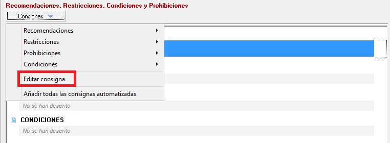 Gestiona el acceso a [Añadir condiciones] ubicado en [Consignas] -> [condiciones] donde el usuario puede añadir de manera manual desde el mantenimiento. Con RW se habilita la herramienta quedando deshabilitada con D. En la siguiente imagen vemos exactamente donde se encuentra la herramienta que afecta el permiso