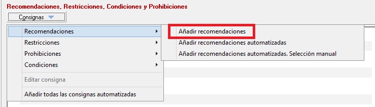 Gestiona el acceso a [Añadir recomendación] ubicado en [Consignas] -> [Recomendaciones] donde el usuario puede añadir de manera manual desde el mantenimiento. Con RW se habilita la herramienta quedando deshabilitada con D. En la siguiente imagen vemos exactamente donde se encuentra la herramienta que afecta el permiso
