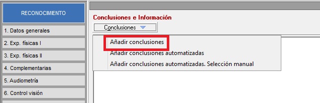 Gestiona el acceso a [Añadir Conclusiones] ubicado en el desplegable [Conclusiones] de la pestaña de conclusiones del reconocimiento médico, donde el usuario puede añadir de manera manual desde el mantenimiento. Con RW se habilita la herramienta quedando deshabilitada con D. En la siguiente imagen vemos exactamente donde se encuentra la herramienta que afecta el permiso