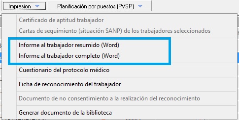 Gestiona el acceso a [Informe al trabajador resumido (Word)] y [Informe al trabajador completo (Word)] ubicado en el desplegable [Impresión] en el área de reconocimientos médicos y dentro del propio reconocimiento en el menú lateral izquierdo dentro del desplegable "Informes". Con RW se habilitan ambas herramientas mientras que con D quedan deshabilitadas.