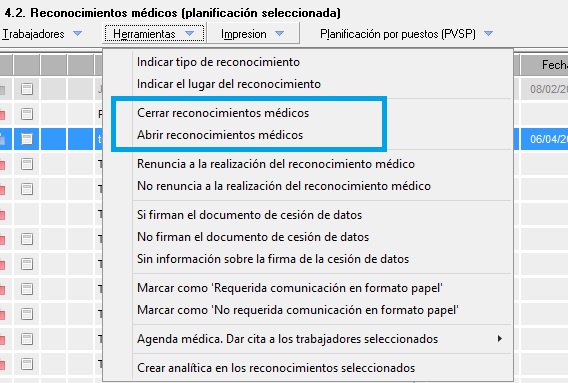 Gestiona el acceso a [Abrir reconocimiento médico] y [Cerrar reconocimiento médico] ubicado dentro del propio reconocimiento (menú superior [Estado reconocimiento]) como en el listado de trabajadores en reconocimientos en el desplegable [Herramientas]. Con RW se habilitan las herramientas mientras que con D quedan deshabilitadas.