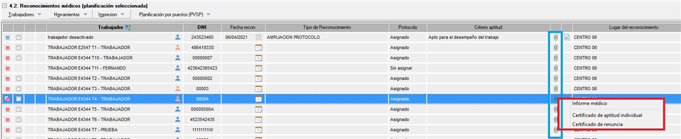 Gestiona el acceso a [Certificado de aptitud trabajador], [Cartas de seguimiento (situación SANP) de los trabajadores seleccionados] y [Documento de no consentimiento a la realización del reconocimiento] ubicado en el desplegable [Impresión] dentro del área de reconocimientos. También añade la opción para imprimir el certificado de aptitud dentro del propio reconocimiento, en la opción correspondiente en el desplegable "Informes" ubicado en el menú lateral izquierdo. Con RW se habilitan las herramientas mientras que con D quedan deshabilitadas.