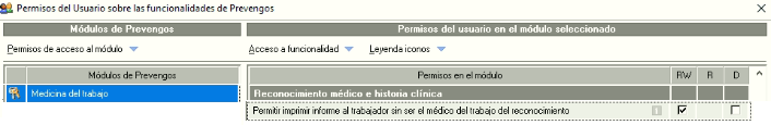 Concederá al médico del trabajo que tenga habilitado este permiso la posibilidad de imprimir el informe de reconocimiento sin ser el médico del trabajo asociado a dicho reconocimiento. Con RW se habilita la herramienta quedando deshabilitada con D.