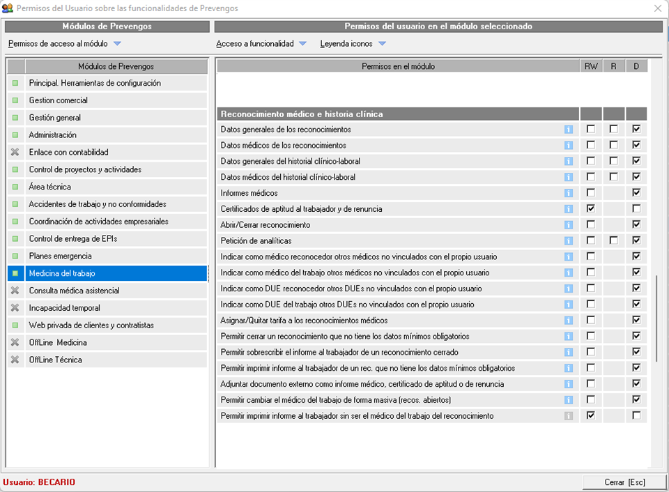 Teniendo en cuentas estas dos opciones, si en este permiso habilitamos la opción RW tendremos acceso total a los datos médicos, en solo lectura con R o se denegarán con D desapareciendo esta opción y sustituyéndose por el acceso al criterio de aptitud.