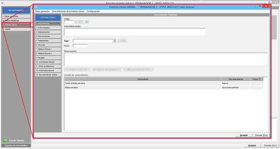 A modo de ejemplo vemos como sería esta ventana del reconocimiento médico cuando tenemos permiso habilitado de acceso a datos generales y datos médicos: