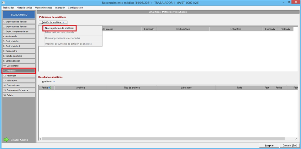 Gestiona el acceso a [Petición de analíticas) ubicado en el menú izquierdo [analíticas] dentro del reconocimiento médico de un trabajador. Con RW el usuario puede crear/editar/eliminar peticiones de analíticas, con R el acceso es de solo lectura sin poder modificar las peticiones existentes y con D es denegado el acceso
