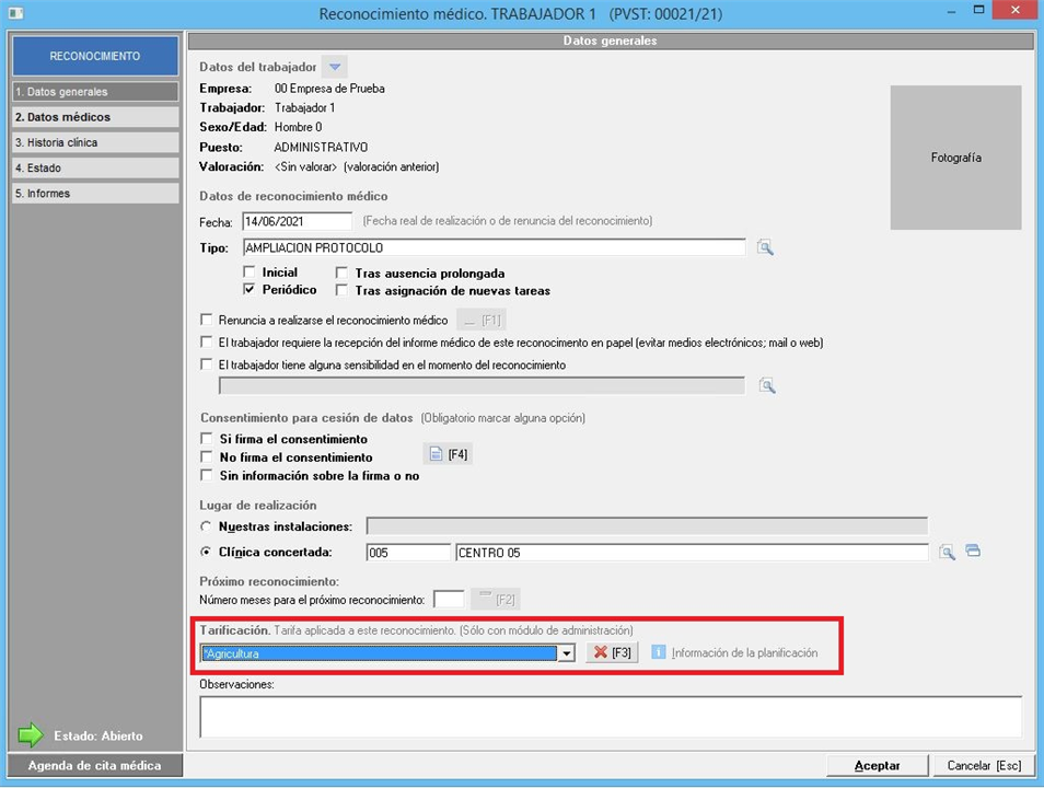 Gestiona que se pueda asociar la tarifa al reconocimiento, dentro del mismo, en la pestaña de datos generales. Indispensable que la campaña esté vinculada a un contrato. Con RW se habilita el campo [tarifa aplicada a este reconocimiento. (solo con módulo de administración) quedando deshabilitado con D. Esta tarifa se utiliza para la facturación de los reconocimientos médicos.