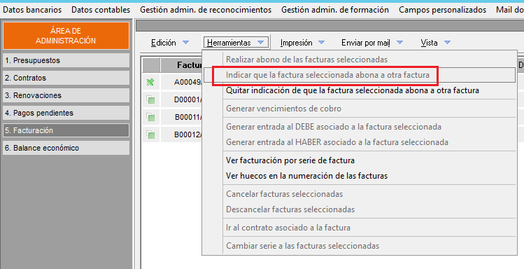 Una vez generada la factura de abono parcial, debe indicar a que factura abona. Seleccione la factura de abono parcial que ha generado y marque Herramientas->Indicar que la factura seleccionada abono a otra factura.