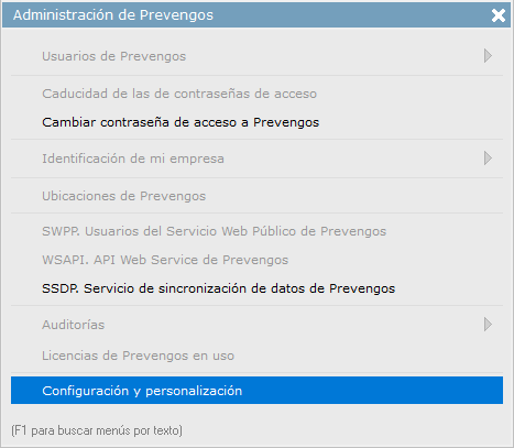 Prevengos dispone de una configuración general donde encontramos diferentes configuraciones por cada módulo existente en Prevengos. Estas opciones las encontramos en la pantalla principal de Prevengos, dentro del menú superior Configuración > Configuración y personalización, tal y como vemos en la siguiente imagen: