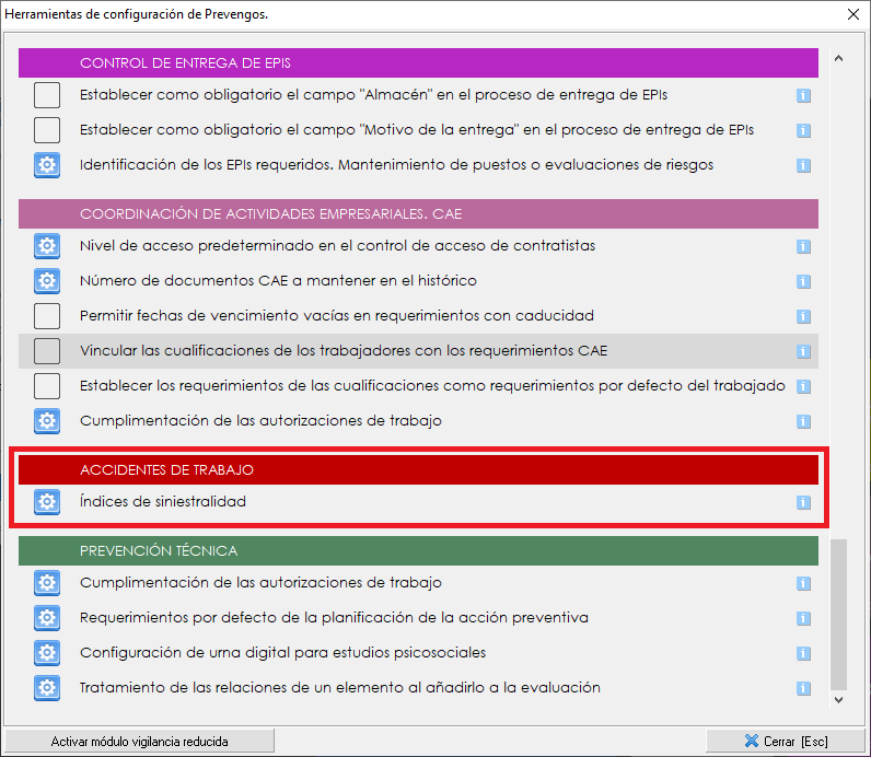 Esta configuración nos permite configurar de dónde se obtendrán los datos para el cálculo de los índices de siniestralidad. Accederemos a la herramienta mediante el icono