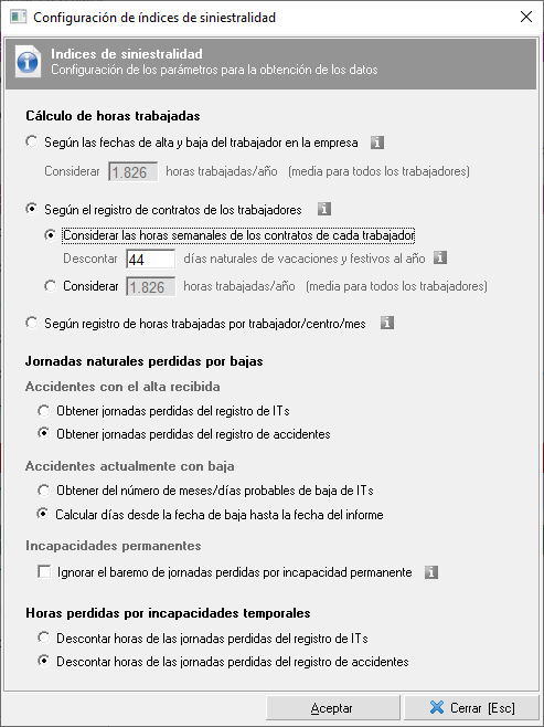 - Horas perdidas por incapacidades temporales. Podemos seleccionar si descontar horas de las jornadas perdidas según el registro de ITs o según el registro de accidentes.