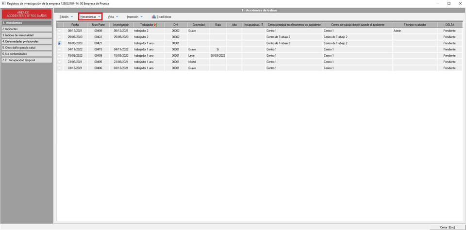 Como podemos apreciar, vemos un listado de accidentes existentes en la empresa, en los cuales podemos gestionar masivamente con las opciones disponibles en el desplegable Herramientas. En los siguientes apartados veremos cada una de estas opciones con el fin de explicar el proceso que se realiza.