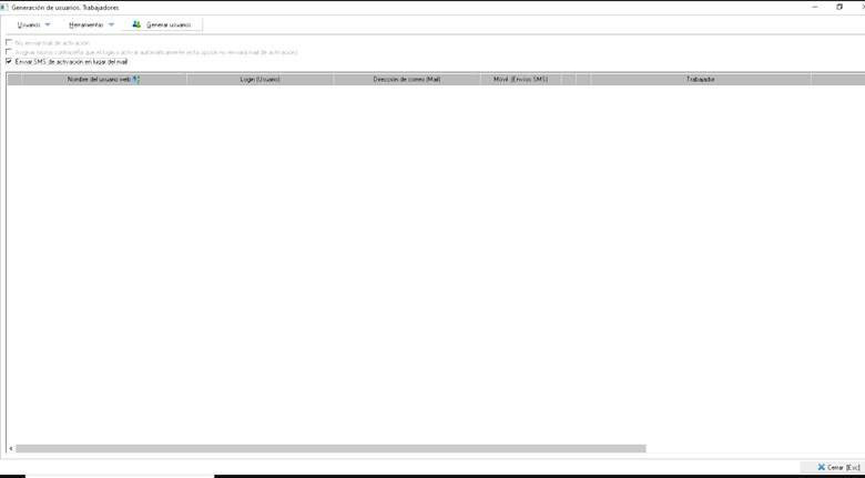 Para crear el usuario web rol trabajador, deben hacerlo de la misma forma que lo hace cuando manda la activación por email, pero en la pantalla donde añade los trabajadores a los que quiere crearles el usuario debe marcar ‘Enviar SMS de activación en lugar del mail’