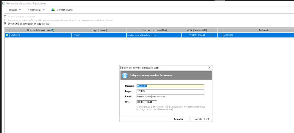 Al pinchar en Generar usuarios, se generará el usuario de la misma forma que cuando manda la activación por email pero en vez de mandar un email, mandará un SMS.