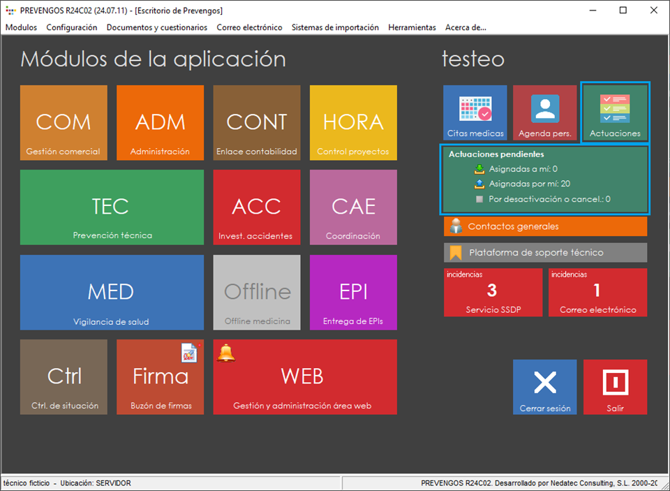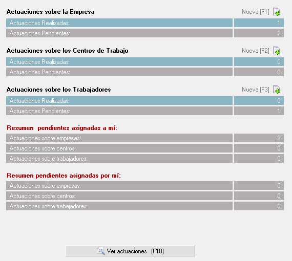 Las actuaciones se encuentran en la parte derecha de la pantalla principal de Prevengos, desde donde también se dispone de un resumen de todas las pendientes, diferenciando numéricamente aquellas que han sido asignadas por usted mismo de las que le han asignado otros usuarios, además de las generadas automáticamente por desactivación o cancelación de empresas que tengan sin leer.