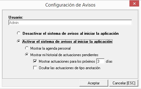 Vemos diferentes opciones, con la opción Activar el sistema de avisos al iniciar la aplicación nos permitirá elegir entre dos opciones:
