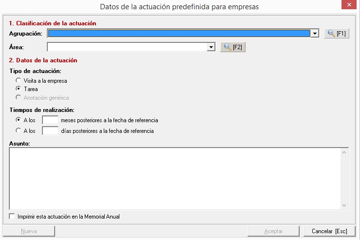 La parte derecha de la ventana tendemos el check para marcar que la actuación/es creadas se impriman en la memoria anual, al igual que podemos seleccionar si la actuación va a ser una anotación genérica, una tarea o una visita a la empresa. Establecemos en los campos Prevista la fecha que creemos que va a ser realizada la actuación, quedando el campo Realizada pendiente de rellenar cuando se complete la actuación. Por último, en el campo Asunto escribiremos lo que veamos conveniente sobre la propia actuación.