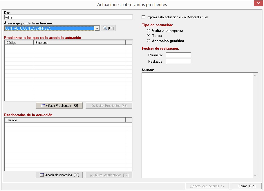 Tenemos una herramienta para crear de manera masiva actuaciones para varios preclientes y destinatarios. Una vez ejecutado veremos la ventana que tenemos justo debajo de este texto, teniendo diferentes opciones.