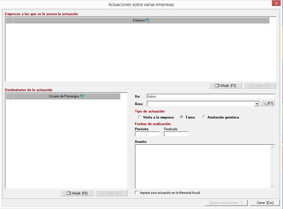Por último, en la parte inferior derecha tenemos el campo De el cual se rellena automáticamente con el usuario que ejecuta la herramienta, a diferencia del campo Área donde podemos establecer el área que tendrá la actuación desde el mantenimiento. Podemos seleccionar si la actuación va a ser una anotación genérica, una tarea o una visita a la empresa. Establecemos en los campos Prevista la fecha que creemos que va a ser realizada la actuación, quedando el campo Realizada pendiente de rellenar cuando se complete la actuación. Por último, en el campo Asunto escribiremos lo que veamos conveniente sobre la propia actuación. Debajo tenemos el check para marcar que las actuaciones creadas se impriman en la Memoria Anual.