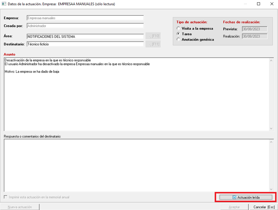 En la parte superior podemos ver la imagen de la ventana que se nos abre al crear una actuación, donde el campo Empresa y Creada por se rellenan automáticamente con los datos de la empresa donde nos encontramos y del usuario que ejecuta la acción.