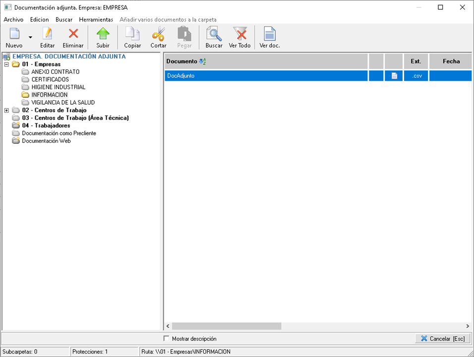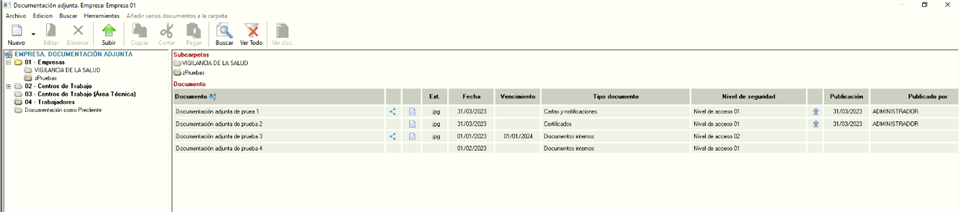 Desde este punto, dentro de la carpeta que nos interese visualizaremos el listado de documentación que hayamos adjuntado, en este caso a la empresa. Tal y como se aprecia en la siguiente imagen.