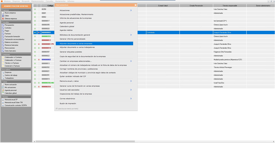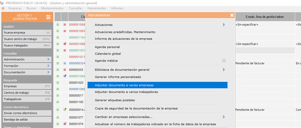 Prevengos dispone de una herramienta que nos permite adjuntar documentos de forma masiva a varias empresas a la vez. Esta herramienta está disponible también para trabajadores pero no para centros o contratas. Para ello iremos al menú Herramientas > Adjuntar documento a varias empresas en los módulos GES/ADM, TEC y MED.