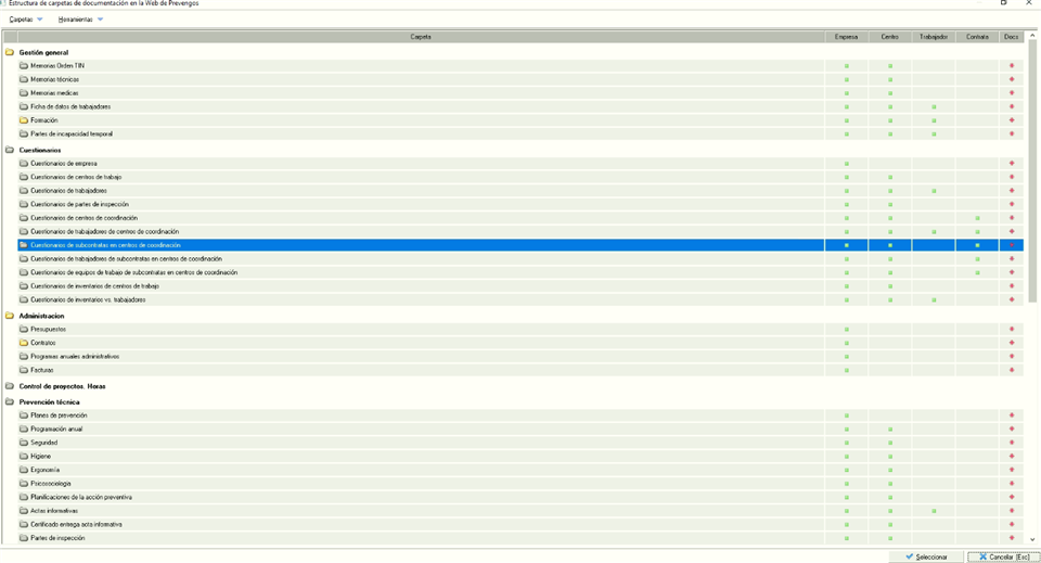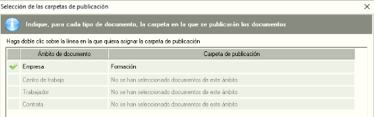 La web dispone de una estructura de carpetas predefinidas, estas son editables por el usuario. Al publicar un documento debemos indicar que carpeta queremos que se visualice este documento en la web. Primero nos mostrará los ámbitos disponibles del documento, esto depende del documento de si el documento es de empresa, centro, trabajador o contrata.